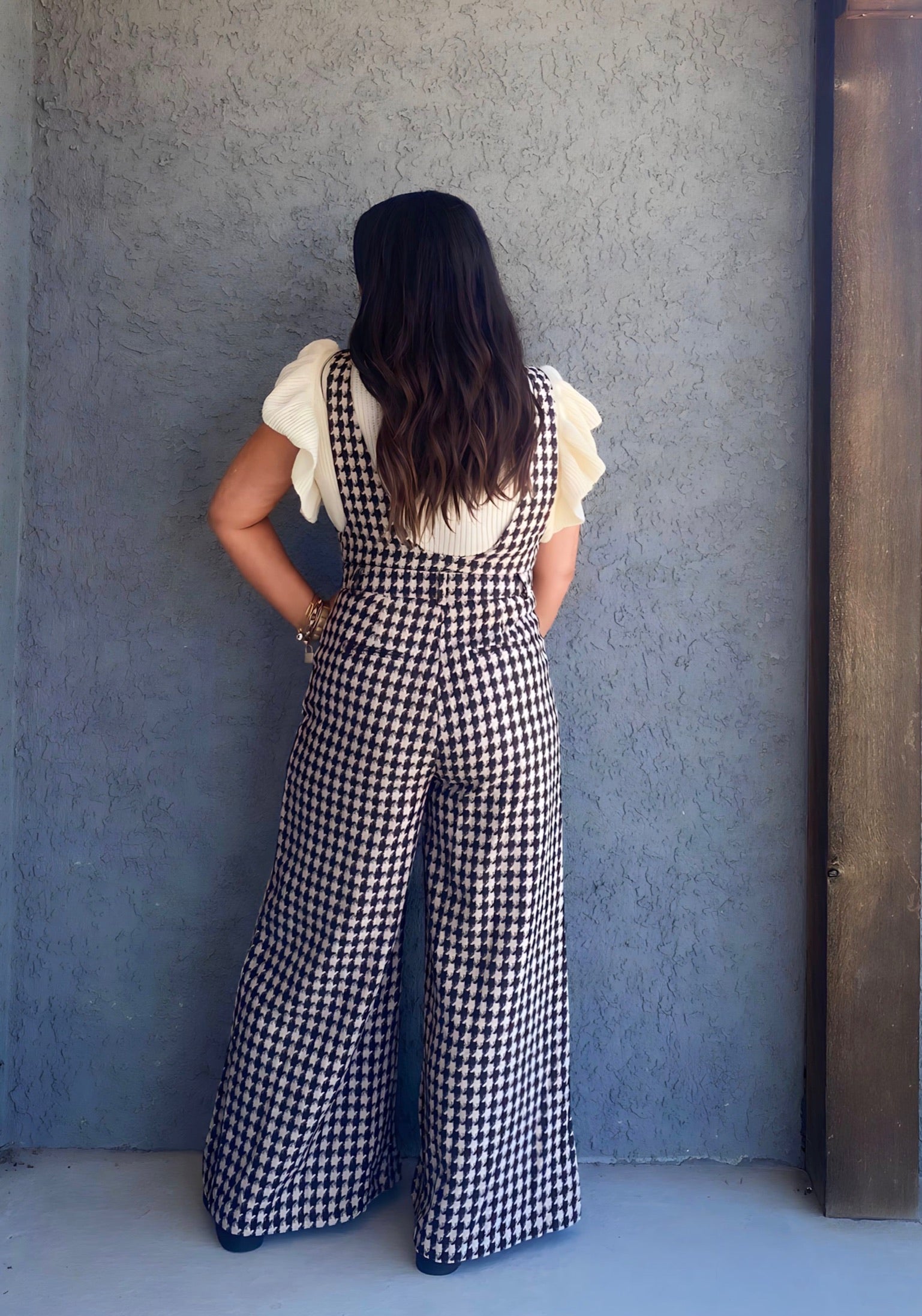 Be the envy of all with this houndstooth print jumpsuit! With a tweed palazzo leg and deep U neckline, this jumpsuit is sure to turn heads. Sleek gold buttons and belt loops give it a touch of class, while the side and back double welt pockets add a unique touch of sophistication. Look sharp and stay comfy with Abbey Houndstooth!