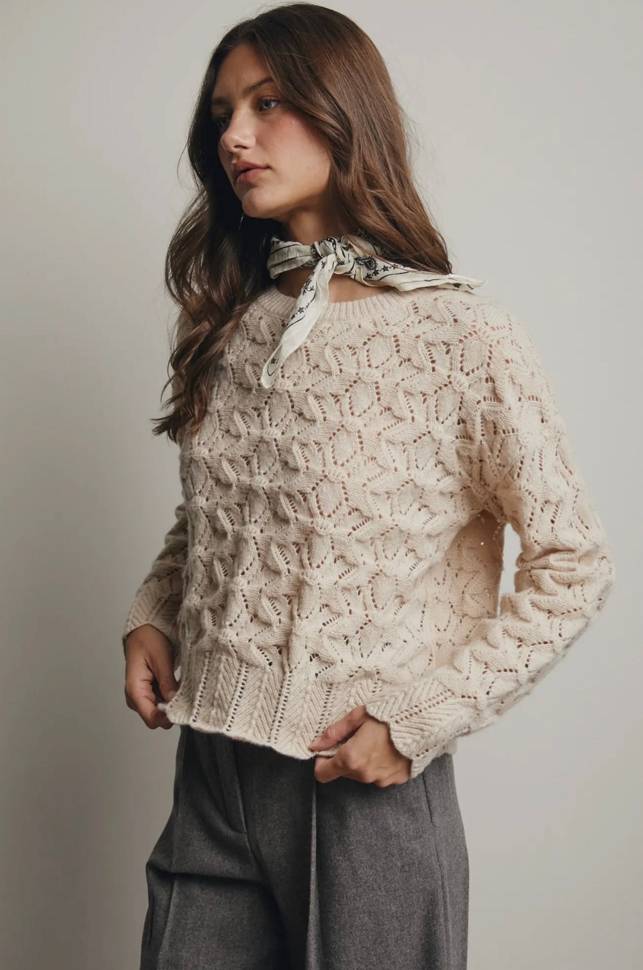 Expertly crafted for comfort and style, the Ellie Pointelle Sweater boasts a soft knit open weave texture and intricate Pointelle design. With a cre neck and classic silhouette, this sweater offers a relaxed fit for easy layering. Elevate your wardrobe with this versatile piece.