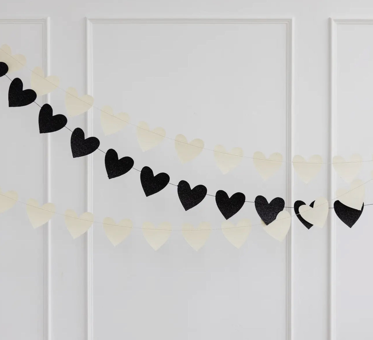 Elevate your decor and add some enchanting sparkle with our Glitter Heart Banner. Perfect for any occasion, this charming banner features black and white hearts for a timeless touch. Let your love shine with this oh so sweet addition to your space.