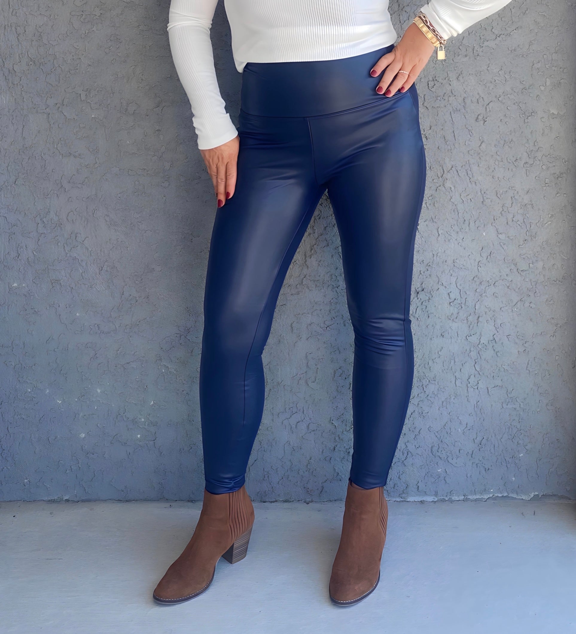 Navy blue high rise faux leather leggings Total waist: 23", inseam: 26.75" approx. - Measured from small