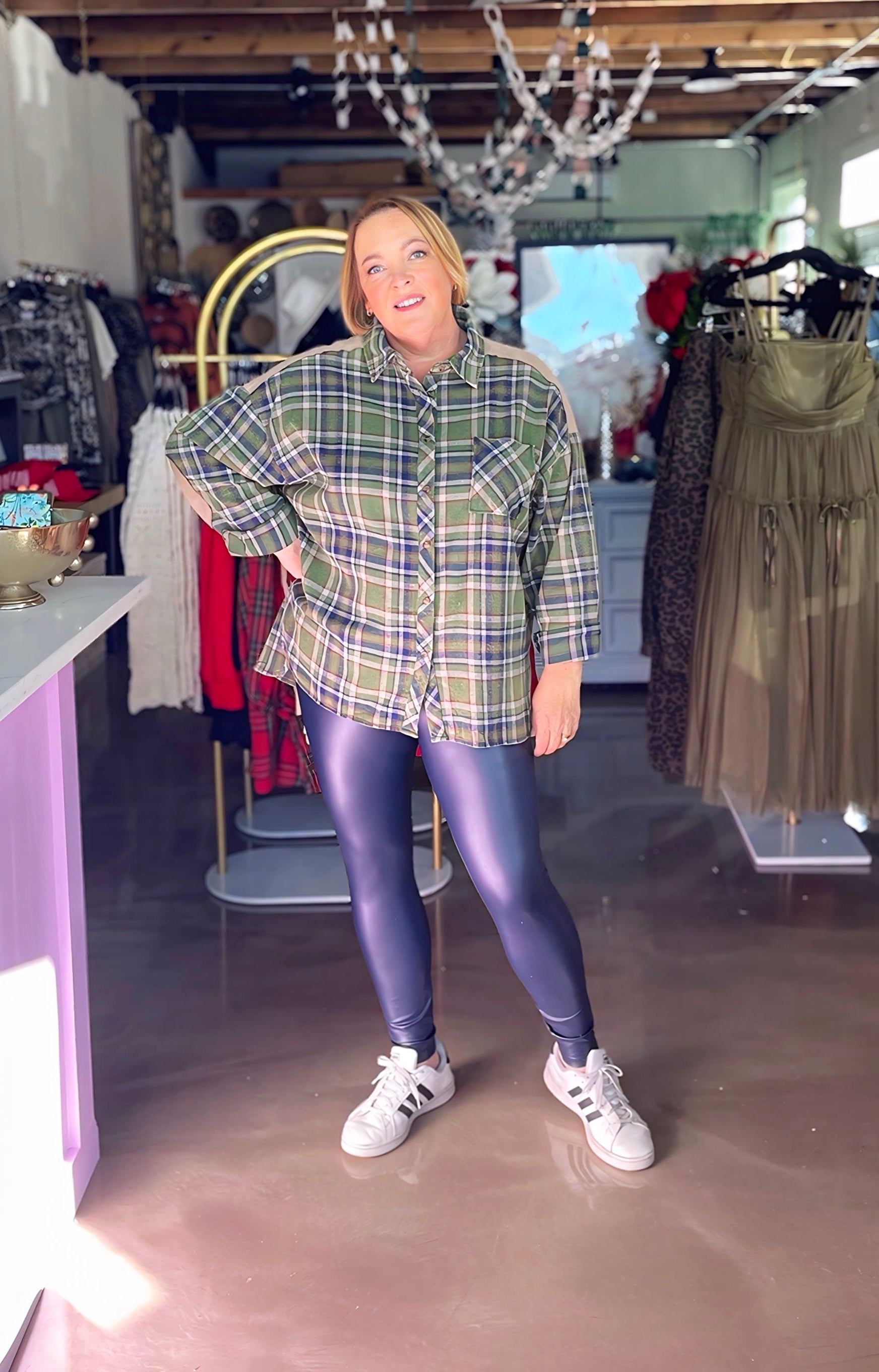 Crafted with delicate details, the Indigo Plaid Flannel is a versatile addition to any wardrobe. Made with a plaid acid-washed design, this soft button down shirt features long sleeves, drop shoulders, and a colored front chest pocket. With side slits and suede fabric on the shoulders and elbows, this flannel offers comfort and style in equal measure.