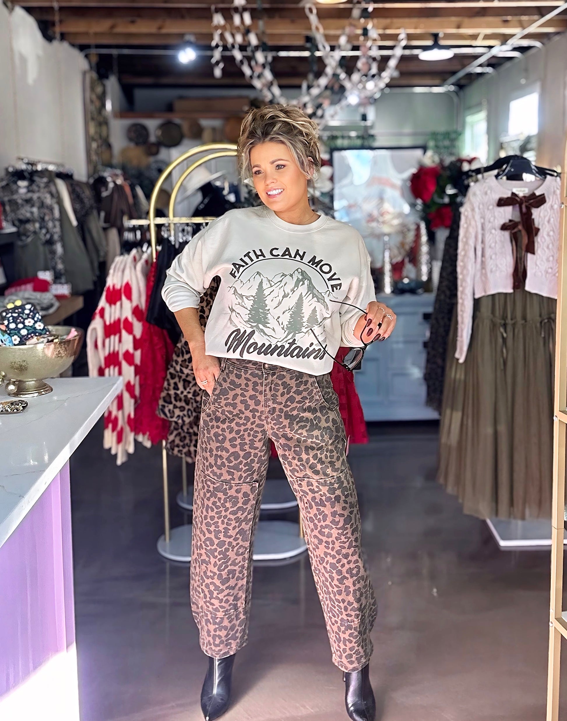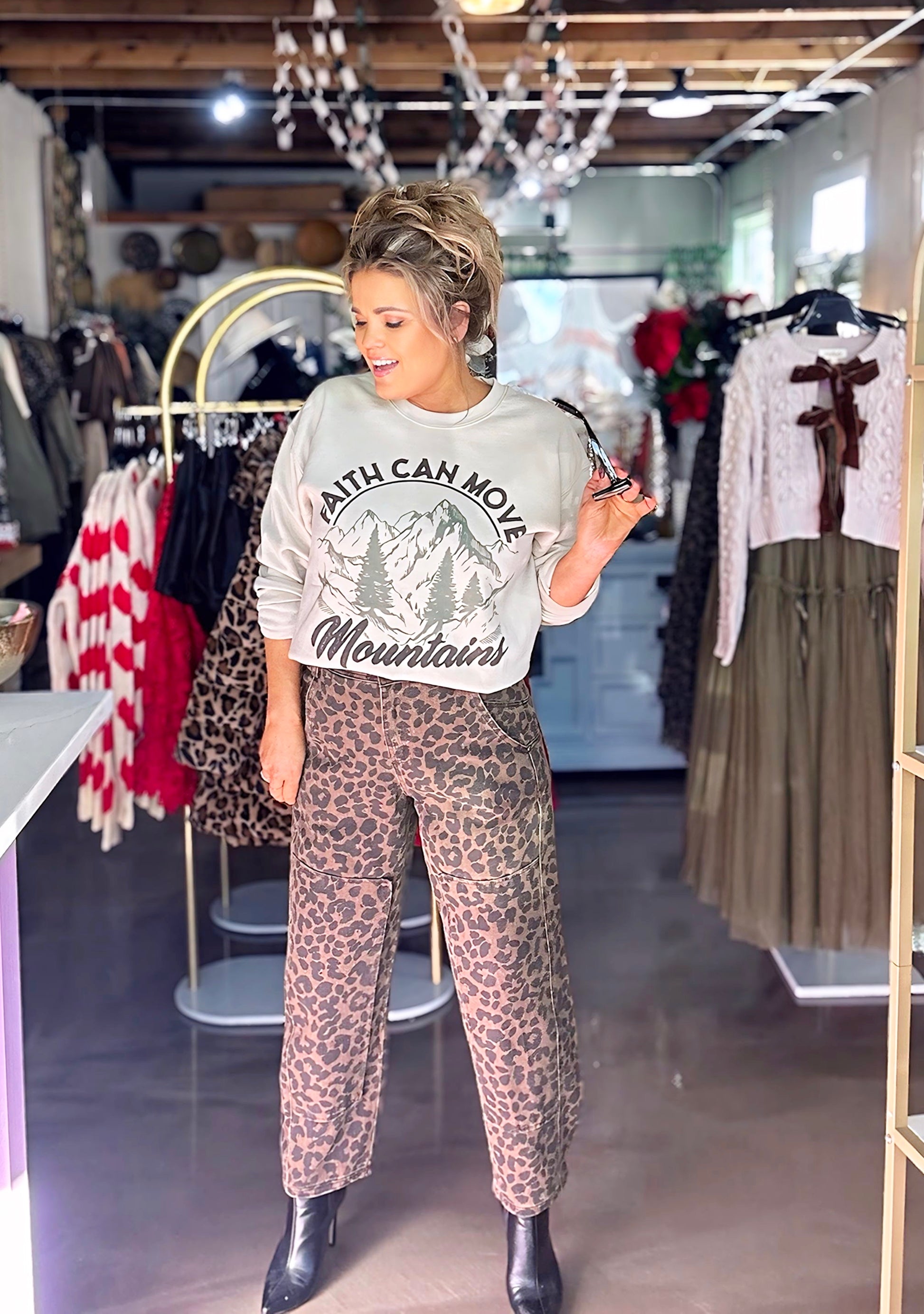 Experience the ultimate in chic comfort with Liv Leopard Wide Leg Jeans. Crafted from leopard print twill, these mid rise, wide leg barrel shaped pants in mocha bring a touch of wild to your wardrobe. Perfect for any occasion, these jeans will have you feeling confident and stylish.