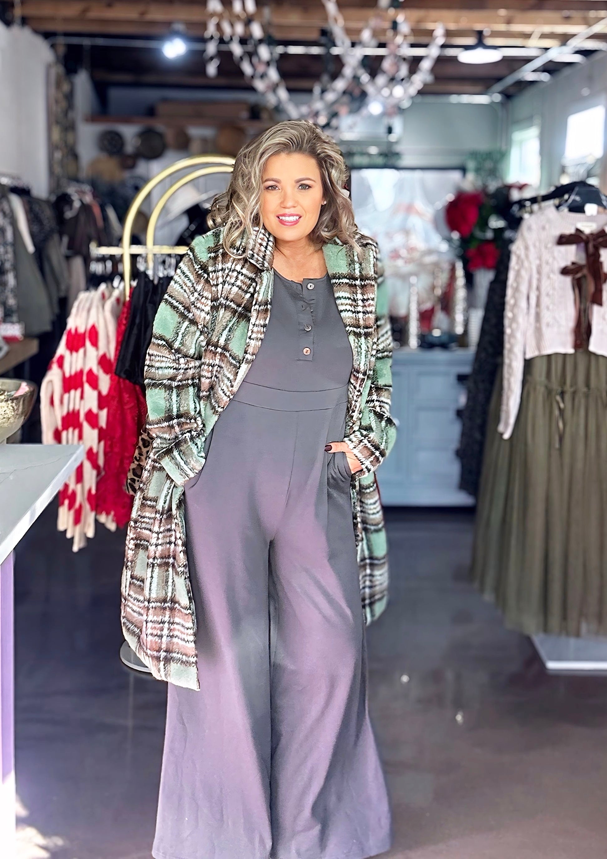 This Serenity Plaid Coat features a stylish green, brown, black, and white plaid design. With a long length and button closure, it offers both fashion and function. Its side pockets provide convenience, making it the perfect coat for any occasion.