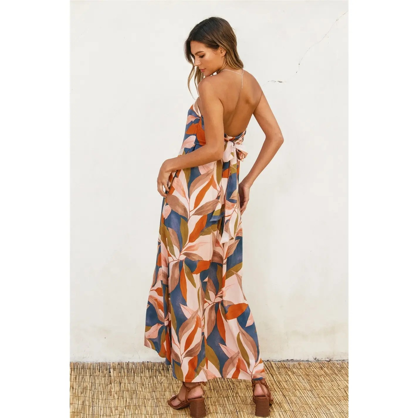 Maximize your summer style with our Tulum Tie Back Maxi Dress! This leafy print dress features a strapless design with grip gel tape and an elastic back band for a secure fit. The back salsa tie adds a touch of elegance, while the pockets provide practicality. Stay chic and comfortable all season long!
